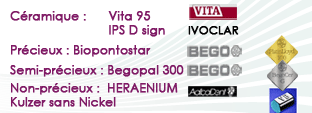 L'or demeure encore aujourd'hui un des matériaux dentaires favori. Il est hautement biocompatible, solide, et son esthétique naturelle en font un des choix les plus courant en dentisterie. Des techniciens hautement qualifiés réaliseront pour vous des restaurations d'une grande qualité et d'une haute précision. D'autres alliages semi précieux ou non précieux sont disponibles.